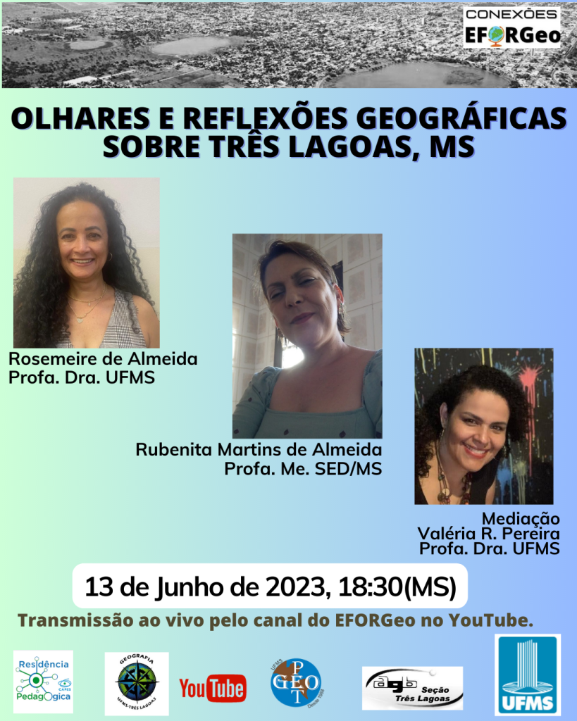 O projeto de extensão Conexões EFORGeo apresenta em 13/6/23 a mesa redonda intitulada “Olhares e reflexões geográficas sobre Três Lagoas, MS”, com a Profa. Dra. Rosemeire Aparecida de Almeida (UFMS) e Profa. Me. Rubenita Martins de Almeida (SED/MS).