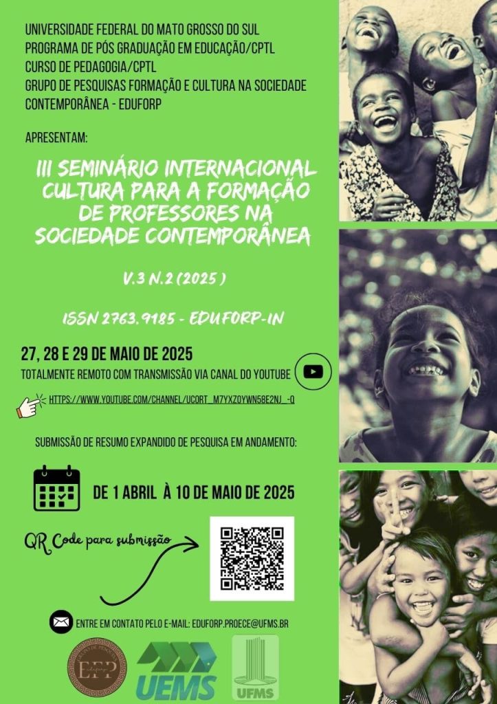 Link para inscrição es envio de resumos simples e/ou expandidos de pesquisas em andamento ou finalizadas: https://periodicos.ufms.br/index.php/EduForP/index