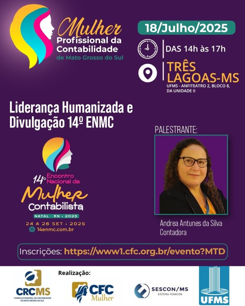 O Workshop Presencial “Liderança Humanizada e Divulgação 14º ENMC – Encontro Nacional da Mulher Contabilista” será realizado no dia 18 de julho, às 14h, em Três Lagoas.
