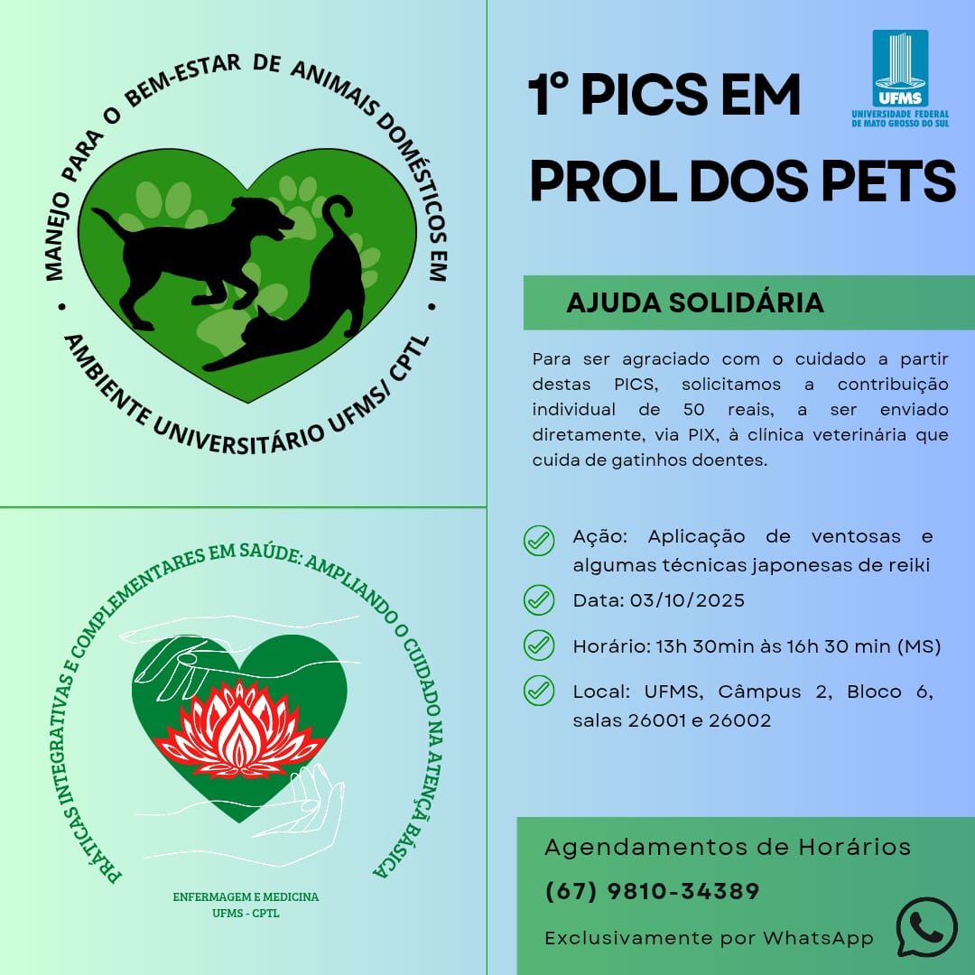 Os membros do projeto de extensão em “Práticas Integrativas e Complementares (PICS)” vão desenvolver uma ação para auxiliar o projeto de extensão “Manejo para o bem-estar de animais domésticos em ambiente universitário” e convidam a todos a participarem do “1° PICS EM PROL DOS PETS”.